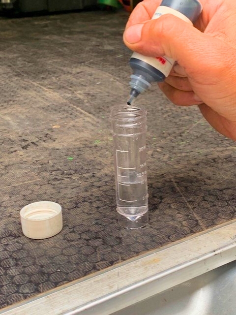 Le test de dureté de l’eau se réalise en utilisant un réactif bleu et une fiole contenant un échantillon d’eau prélevée de la chaudière. Initialement, la fiole contient une solution transparente qui se colore progressivement en ajoutant des gouttes de réactif. En passant par des teintes rose et violette pour finalement devenir bleue. Le nombre de gouttes nécessaires pour atteindre cette couleur finale permet de déterminer la dureté de l’eau.